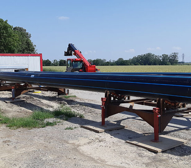 - Außendurchmesser der PE-Rohre: 560 mm bzw. 630 mm (dies entspricht einem Rohrgewicht von insgesamt 1.400 t)