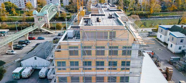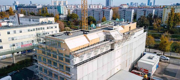 - Herstellung der Gebäudehülle bzw. Fasse samt Wärmedämmverbundsystem, Pfosten-Riegel, vorgehängter Fassade sowie dem Einbau der Fenster