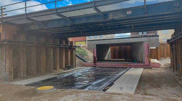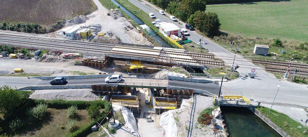 - Bau einer Eisenbahnbrücke (Einschiebung unter Hilfsbrücke)