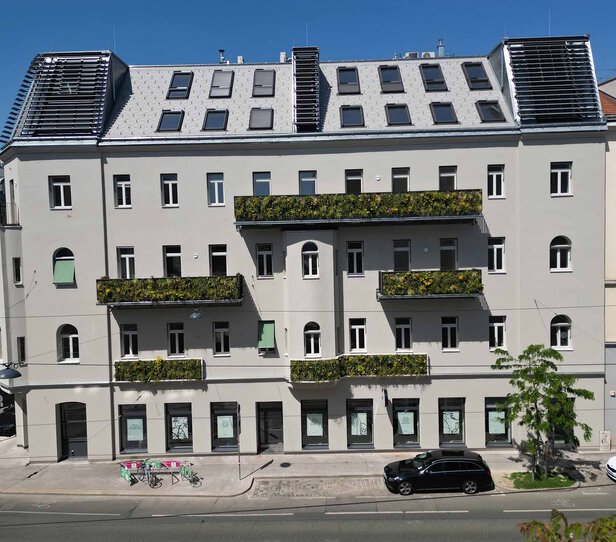 Durchführung einer Sockelsanierung sowie eines zweigeschoßigen Dachgeschoßausbaus.