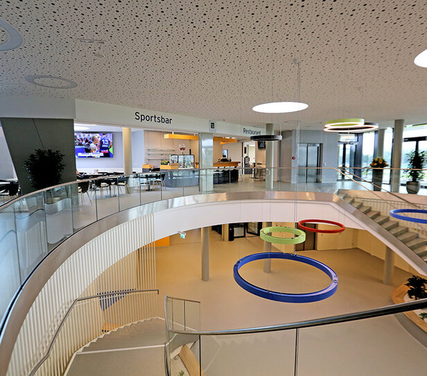 - Errichtung einer neuen zentralen Eingangshalle, mit der die verschiedenen bestehenden Gebäudeebenen verbunden werden und eine Drehscheibe zu allen sportlichen Bereichen entsteht