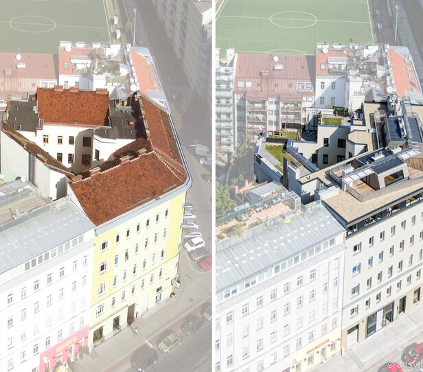 - Dachgeschoßausbau in Holzbauweise mit Maisonettwohnungen und großzügigen Terrassen