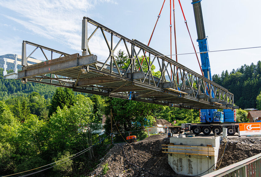 Errichtung der unterwasserseitigen Hilfsbrücke "Steyrbrücke" in St. Pankraz.