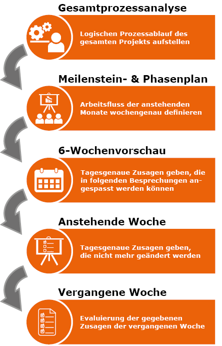 - Ablauf: Gesamtprozessanalyse (GPA) mit Meilenstein- und Phasenplan (MPP) --> Detail-Workshops (Rohbau-, Innenausbau-, Dach/Hülle/ Außenanlagen) --> Lean-Besprechungen (Last Planner Sitzungen-LPS) --> Abschluss-Workshop (Feedbackrunde)