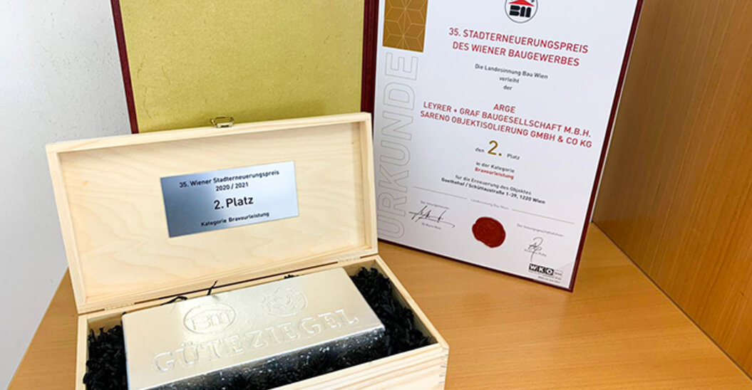 Mit dem Wiener Stadterneuerungspreis werden seit mehr als drei Jahrzehnten ausgezeichnete Wiener stadtbildprägende Sanierungsprojekte vor den Vorhang geholt. Insgesamt wurden heuer 37 Projekte eingereicht und eine Fachjury kürte zehn Projekte in den Kategorien „Pionierleistung“, „Wiener Meisterleistung“ und „Bravour Leistung“. In diesem Jahr wurde auch eine Trophäe verliehen, das Wiener „Güteziegel“ in Gold, Silber und Bronze. Leyrer + Graf durfte sich über die Auszeichnung in Silber freuen.
