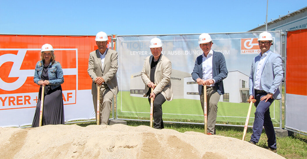 Gmünd / Horn, am 08.07.2021. Mit dem Spatenstich für das neue rund 1.400 m² große Ausbildungszentrum der Unternehmensgruppe Leyrer + Graf, erfolgte Anfang Juli am Standort Horn der offizielle Baustart. In die neue Weiterbildungsstätte, welche vor allem der modernen Lehrlingsausbildung dient, werden insgesamt ca. € 2 Mio. investiert.